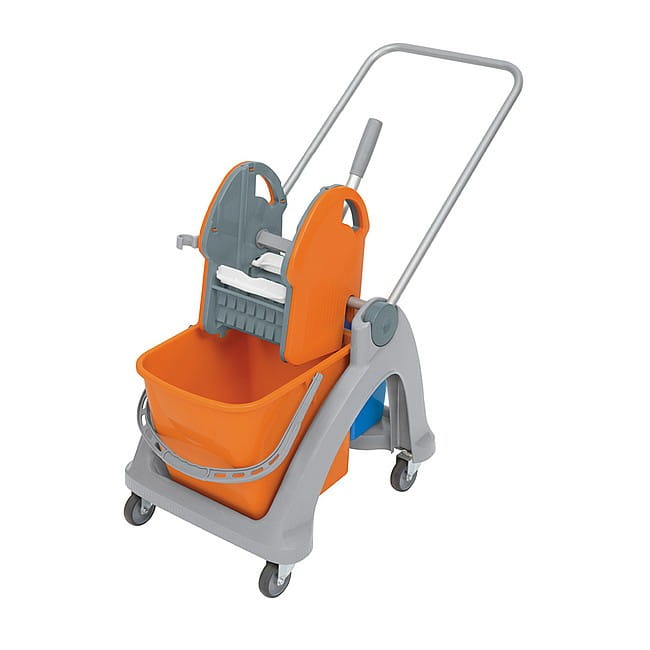 Mobilny wózek z tworzywa sztucznego umieszczony na gumowych kółkach samoskrętnych, które pracują cicho i nie rysują podłoża. Przeznaczony do mycia średnich i dużych powierzchni. Podstawa wózka wyposażona w przekładany uchwyt wykonany z aluminium.