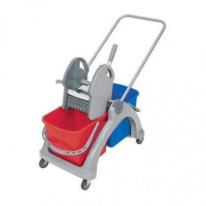 Podstawa wózka wyposażona w przekładany uchwyt wykonany z aluminium. Dwa wiadra o pojemności 25 litrów ( czerwone, niebieskie ) pozwalają na oddzielenie wody czystej od brudnej, co w znacznym stopniu ułatwia mycie powierzchni.